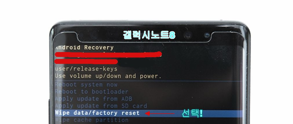 갤럭시노트 8의 공장 초기화를 위한 첫 화면입니다. wipe data/factory reset 메뉴가 보입니다. 이동하는 방법은 볼륨키의 상단과 하단을 누르면 메뉴화면을 움직일수 있고 선택을 위해서 전원 버튼을 눌러주면 됩니다.