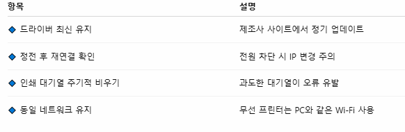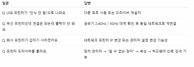 무선 프린터는 IP고정 설정이 핵심이며, 회사 프린터는 네트워크 관리자에게 IP주소 확인을 요청합시다.